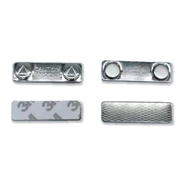 Kovové a magnetické štítky jsou dvě součásti, které tvoří magnetické jmenovky. Magnetický obvod je tvořen kovovou destičkou implantovanou do části magnetické destičky a dvěma nebo třemi neodymovými kotoučovými magnety umístěnými vedle sebe s opačnými póly.